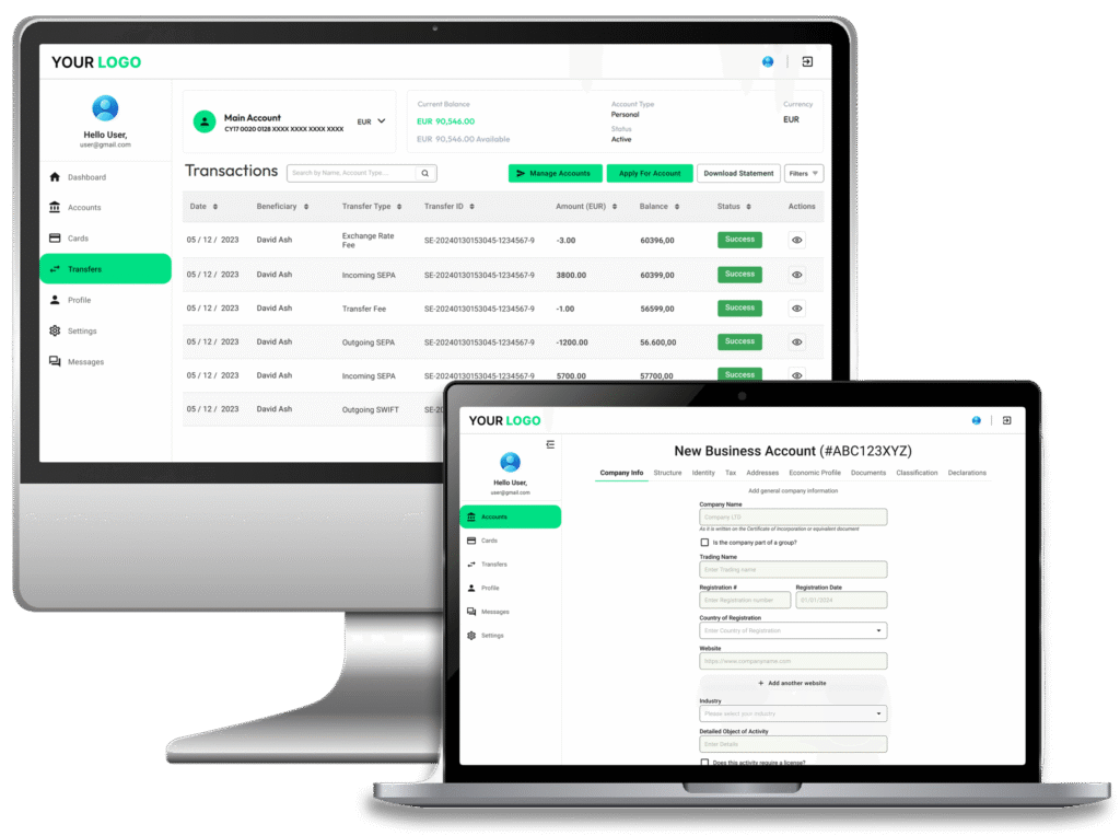 You may decide tyo take the full ready-made solution of Core banking & AML fully incorporated or you may want the Core banking module if you have your own provider of RegTech – Compliance and KYC Screenings in Sanction lists, Adverse media and PEP verification. You may request just the software or the integration with your bank’s APIs.