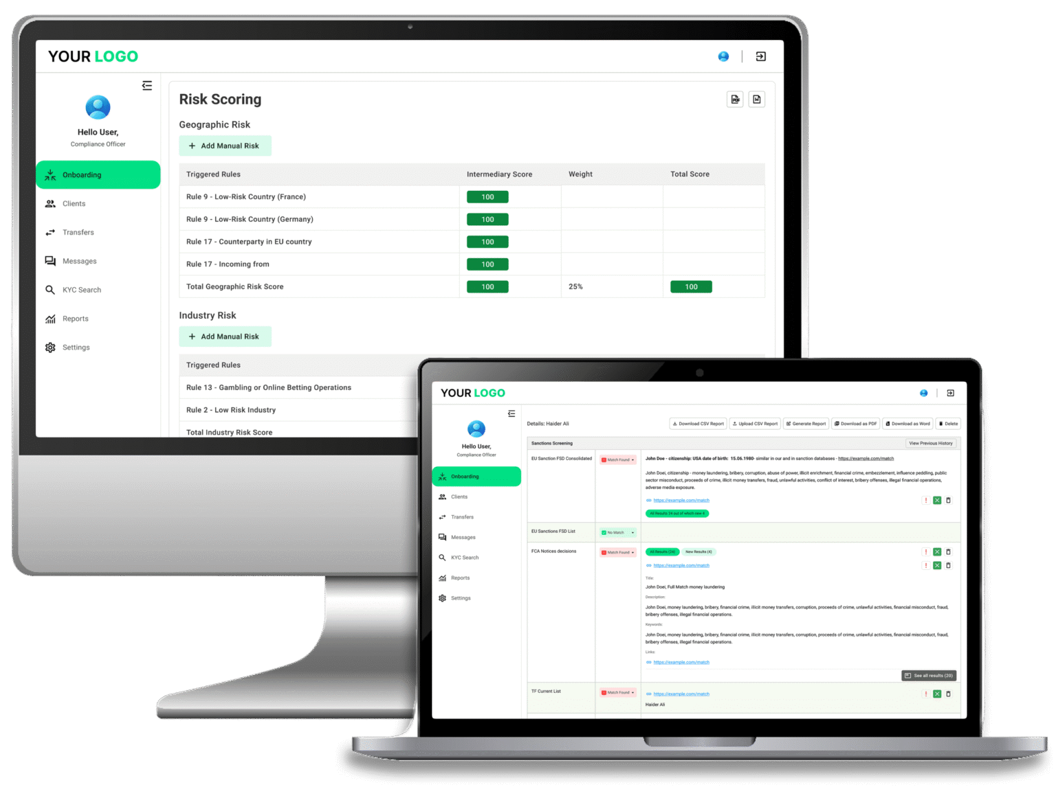 Rules‑based risk scoring for clients and transactions, plus real‑time alerts.